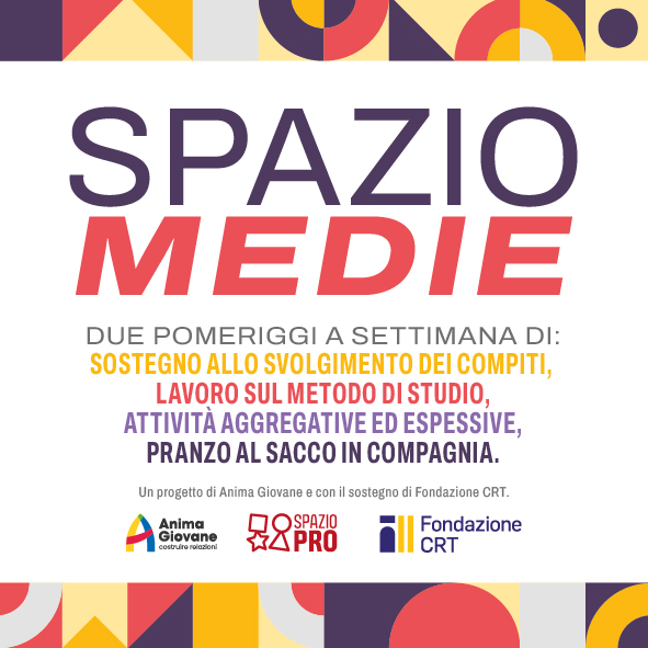 Spazio Medie è un progetto di supporto allo studio, potenziamento del metodo di studio, aiuto nello svolgimento dei compiti, sviluppo delle competenze comunicative e relazionali e di aggregazione e incontro tra pari. È rivolto prevalentemente a studenti e studentesse che frequentano le scuole secondarie di I grado del territorio ( A. Schweitzer, Dante Alighieri e Nigra).